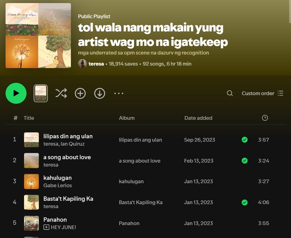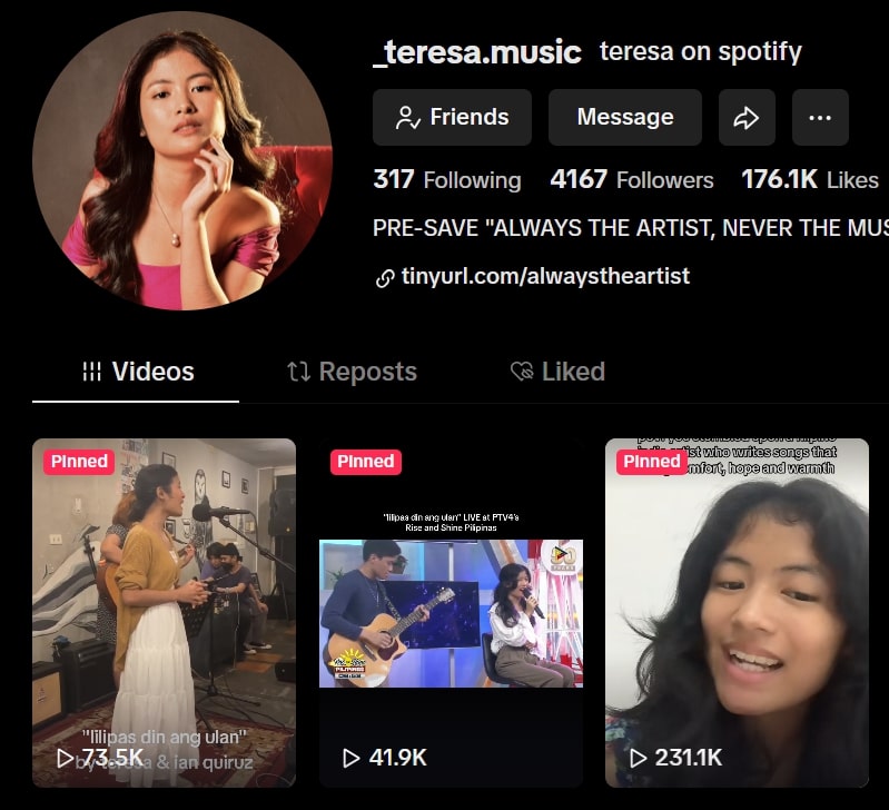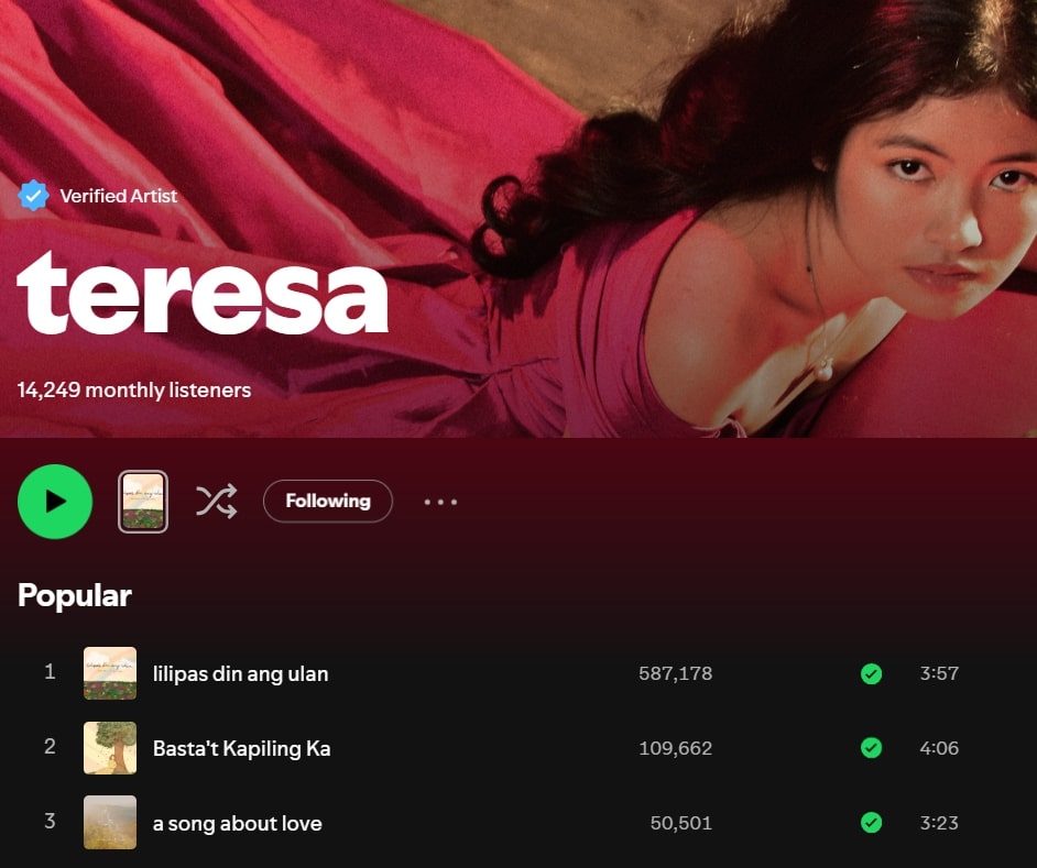 Although independent, teresa has gained a following over the years. Her Spotify profile has seen massive growth over the past four years. She now has 4.3k followers on Spotify, with 13.4k monthly listeners. Her most recent release, lilipas din ang ulan, has reached 590k streams on the platform and has been added to thousands of playlists. Aside from this, two of her songs had also been added to editorial playlists. She has more than 4k followers on TikTok, with more than 175k likes.